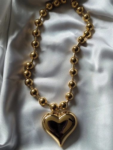 Make a powerful statement with this bold and elegant 18k gold-plated necklace. Featuring a striking oversized heart pendant and chunky gold beads, this piece is designed to stand out while adding a touch of sophistication to any look. The mirror-polished finish reflects light beautifully, making it ideal for both day and night styling.