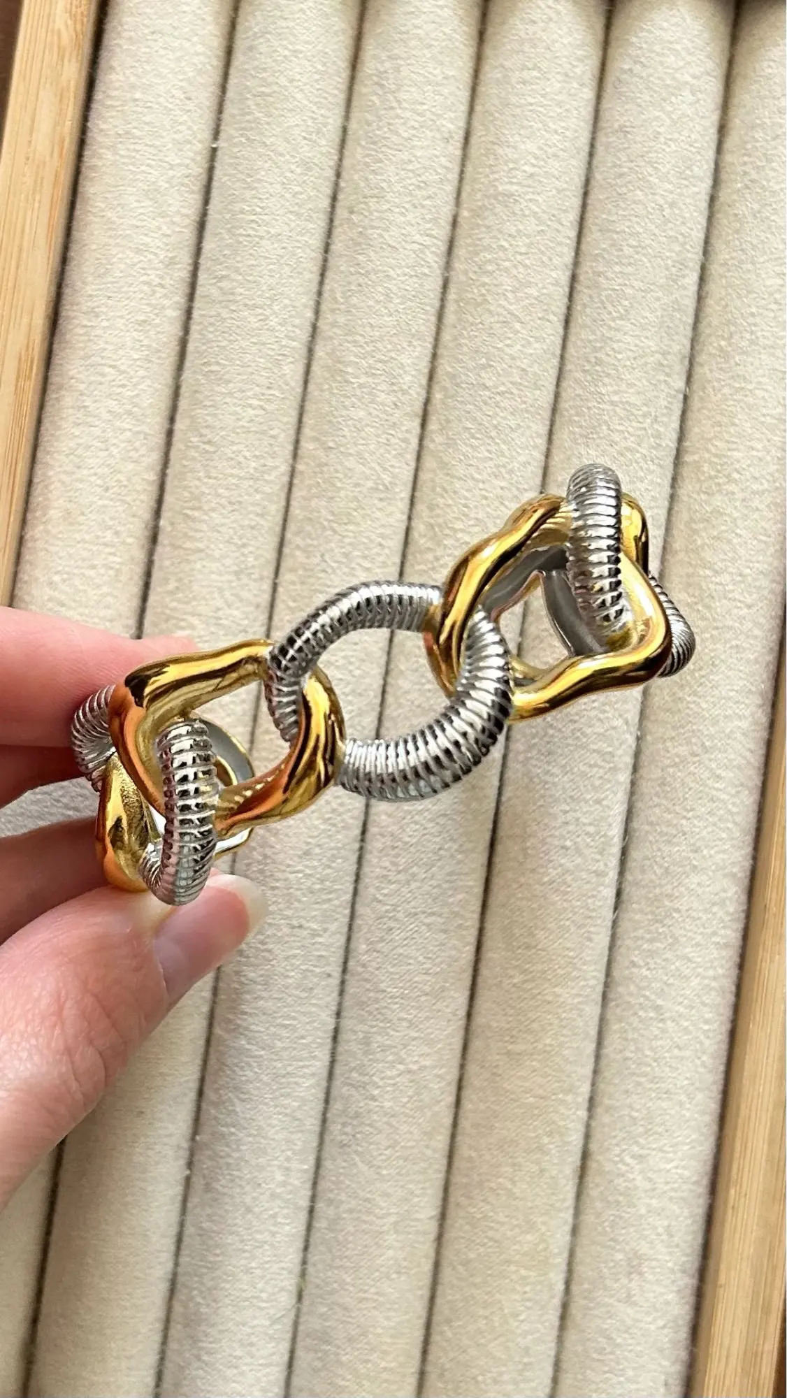 Make a bold statement with this exaggerated, double-color, wide-link chain cuff bracelet. Crafted from durable, high-quality stainless steel and finished with a sleek PVD plating. Designed for women who dare to stand out, this fashion-forward piece combines an edgy style with lasting quality, perfect for adding a fierce touch to your jewelry collection.