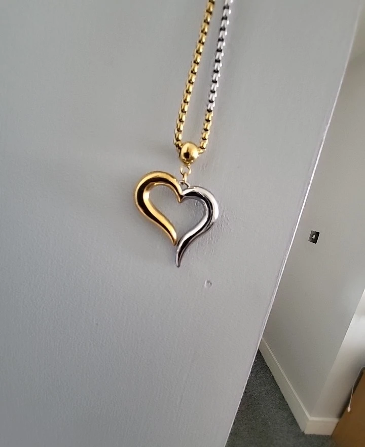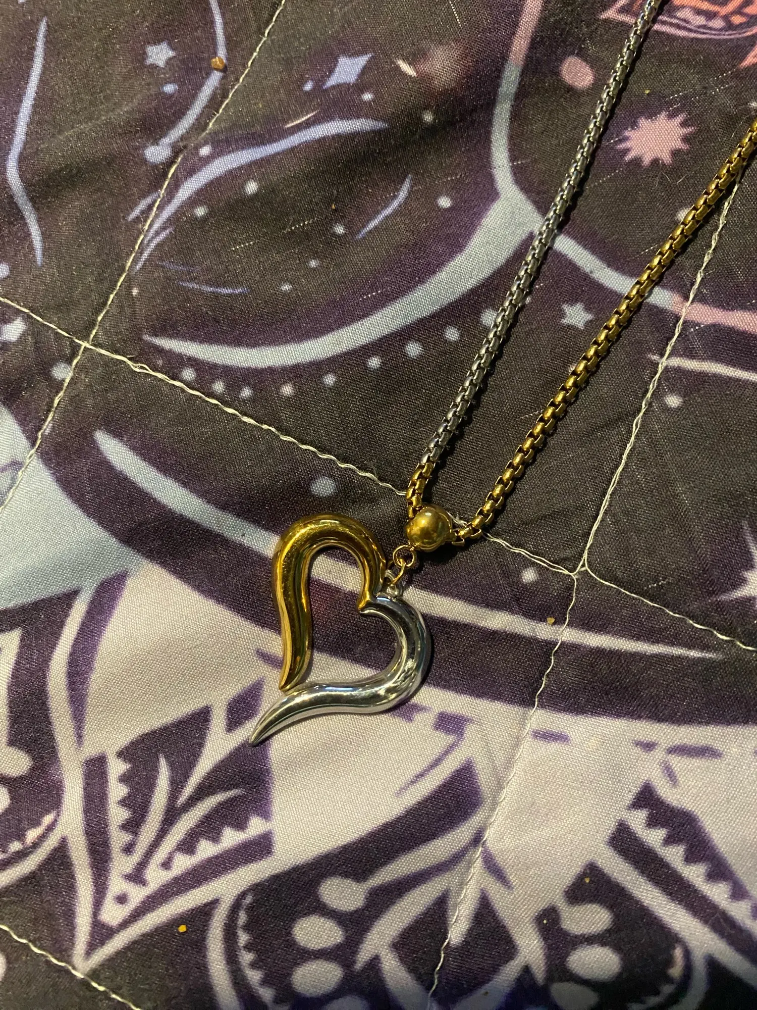 The Mixed Metal Heart Necklace is a bold take on romance. This piece pairs a unique square chain with a large, open heart pendant, creating a modern, high-fashion statement. Crafted with durable 18K Gold Plating on 316L Stainless Steel, it's completely tarnish-free and water-resistant. Effortless elegance that endures.