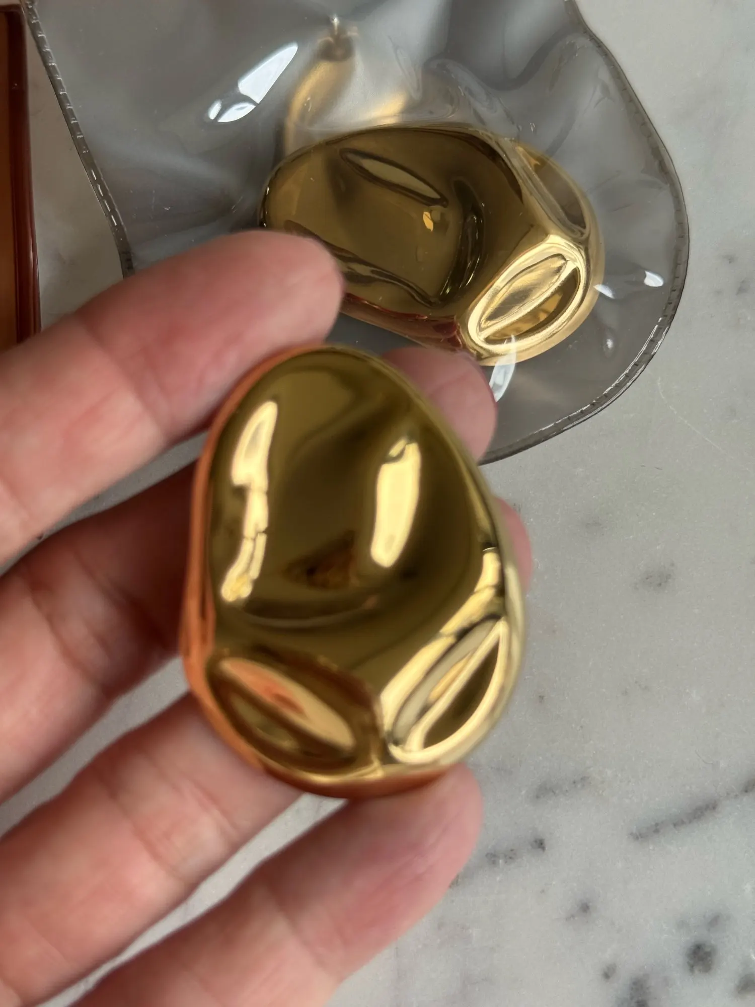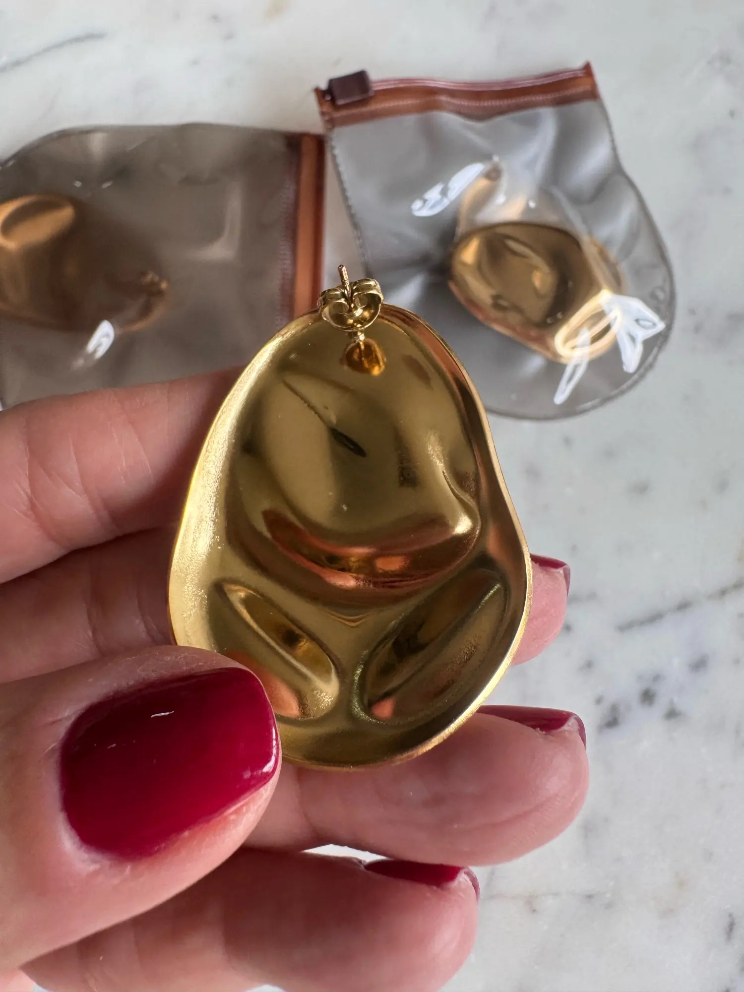 The golden earrings in organic trend completely exceeded my expectations. They are lightweight, of excellent quality, and arrived just on time. They look beautiful, elegant, and modern. Without a doubt, I would buy them again. I recommend both the seller's attention and the quality of manufacturing. A piece that elevates any look.